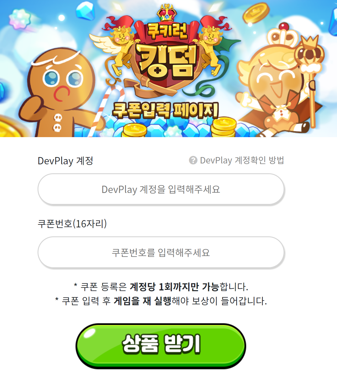 그 후에, 열리게 되는 쿠폰 입력 페이지에 DevPlay에 기재된 유저 정보와 쿠폰번호를 입력해주시면 끝입니다.