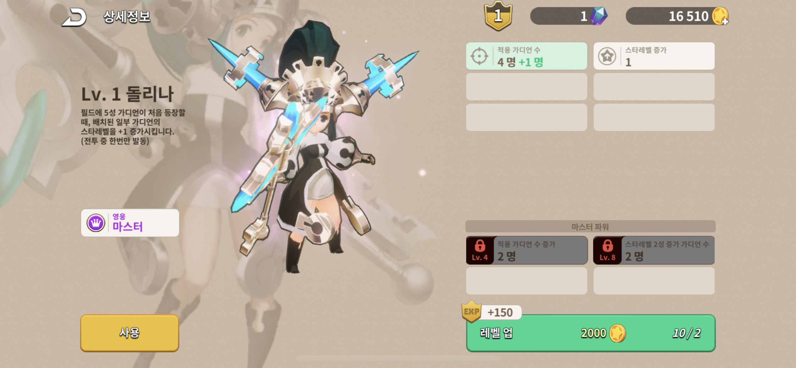 마스터 파워를 올릴수록 적용 가디언의 숫자와 증가시키는 스타 레벨이 증가합니다.
