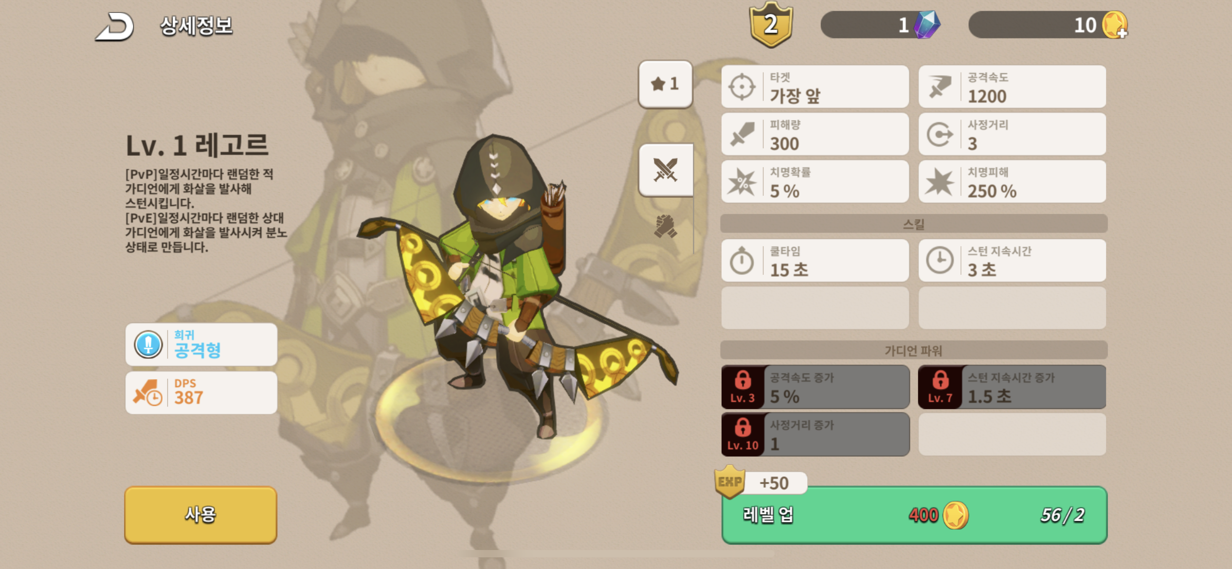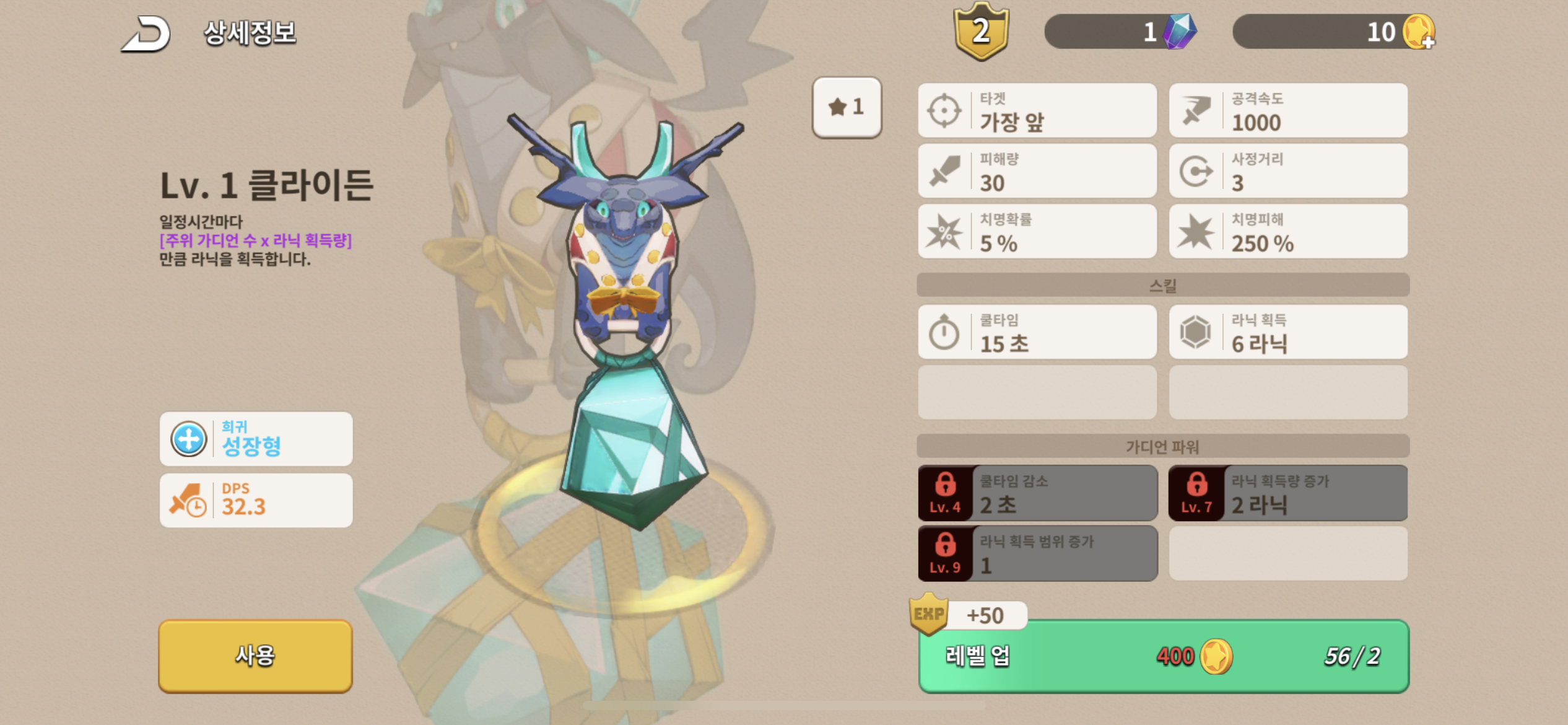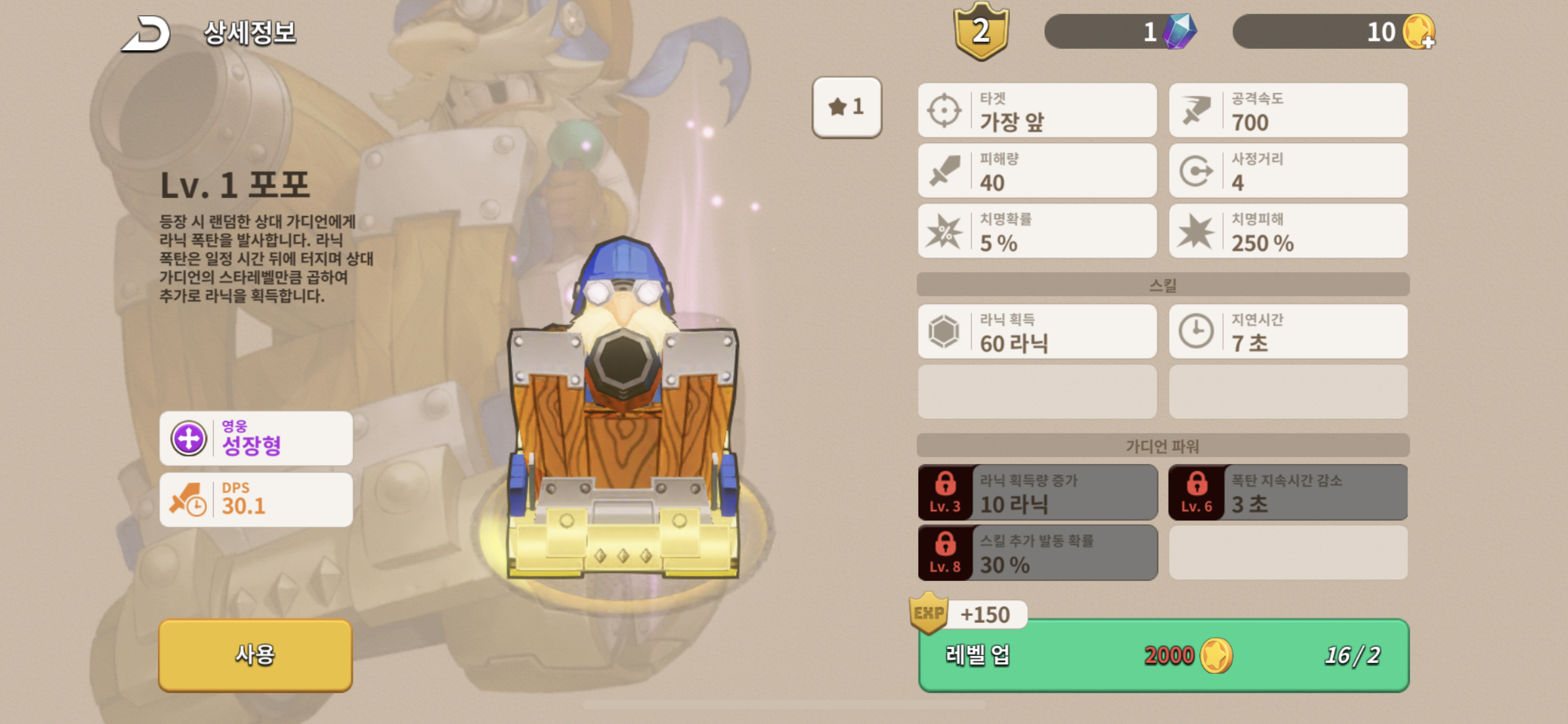 가디언 파워를 올려주면 피해량과 공격 속도, 사정거리가 증가하기 때문에 잘만 키워준다면 계륵 이상의 가치를 해낼 수 있습니다.