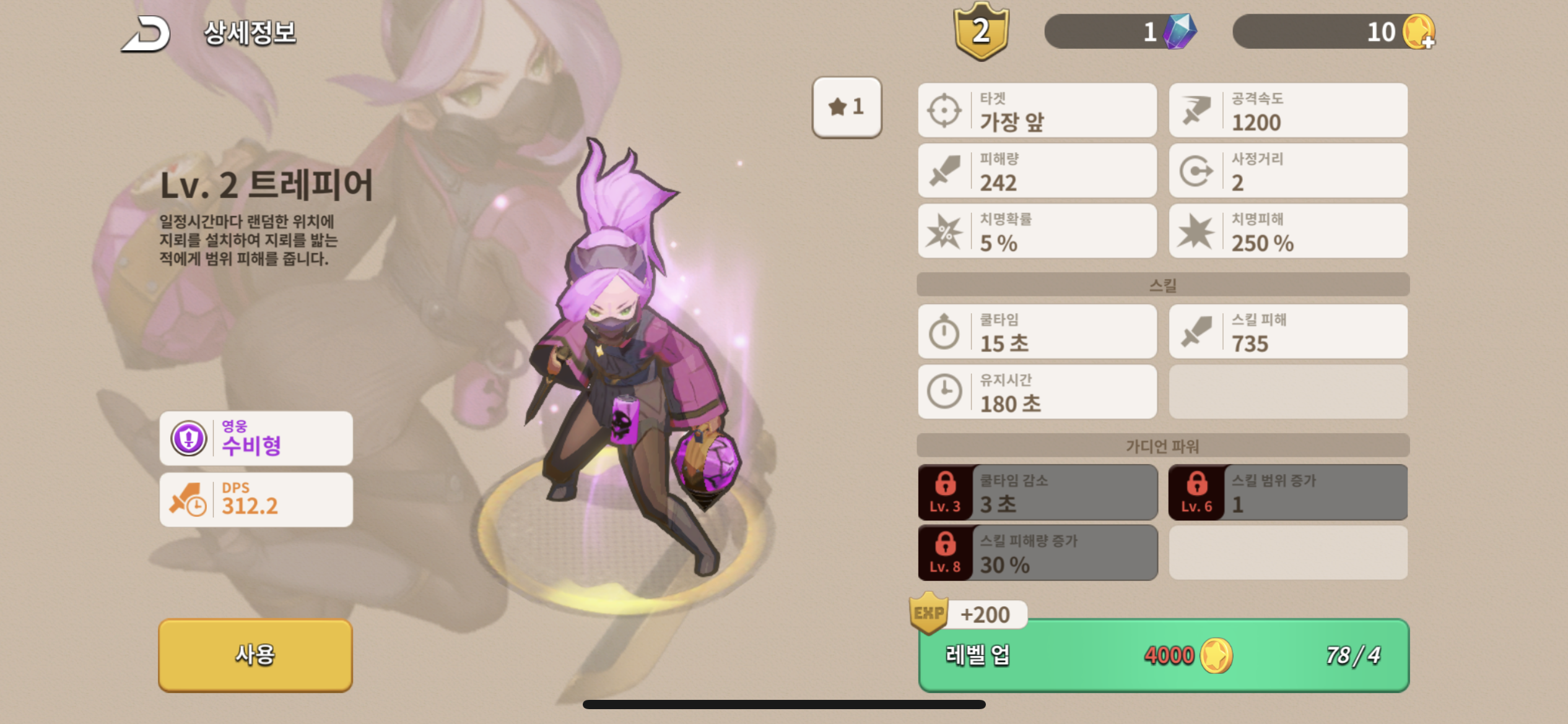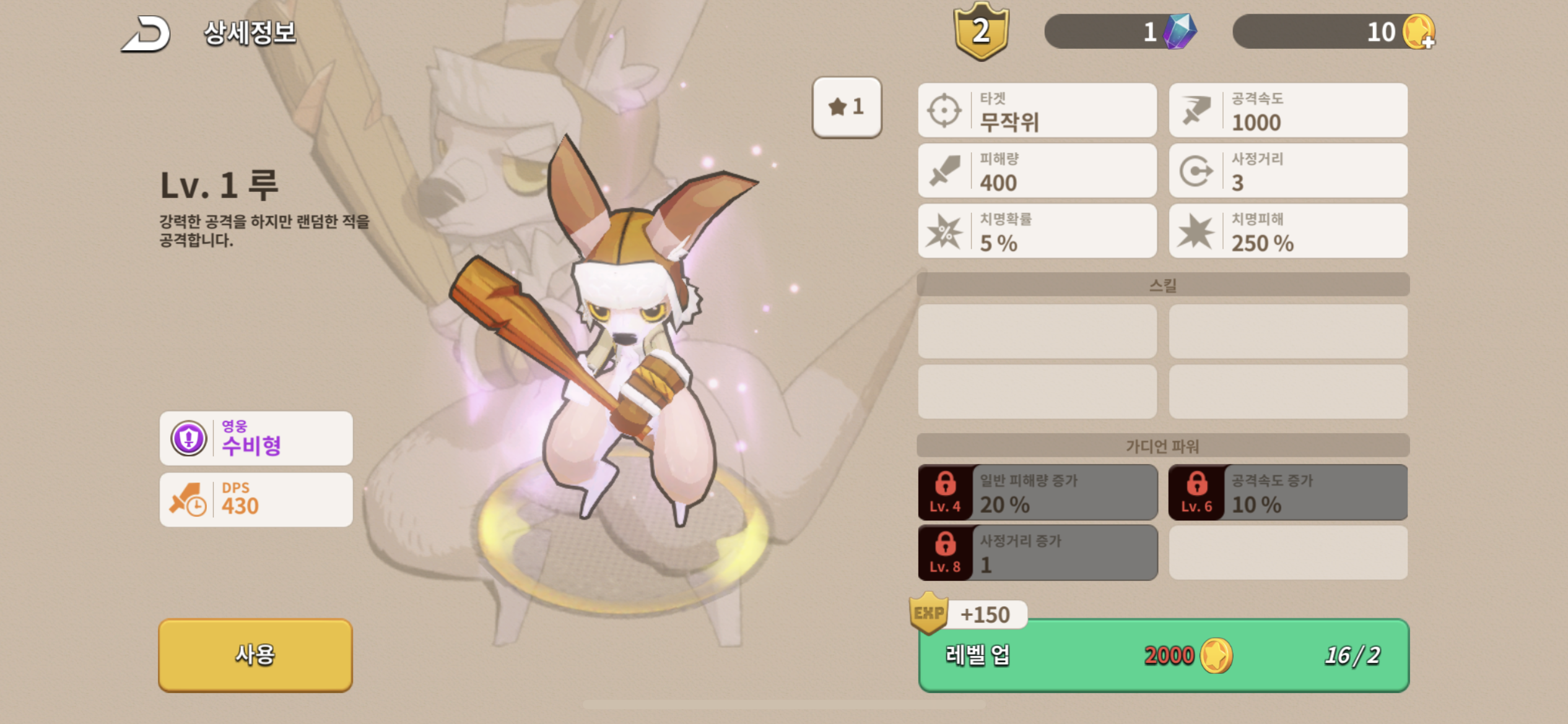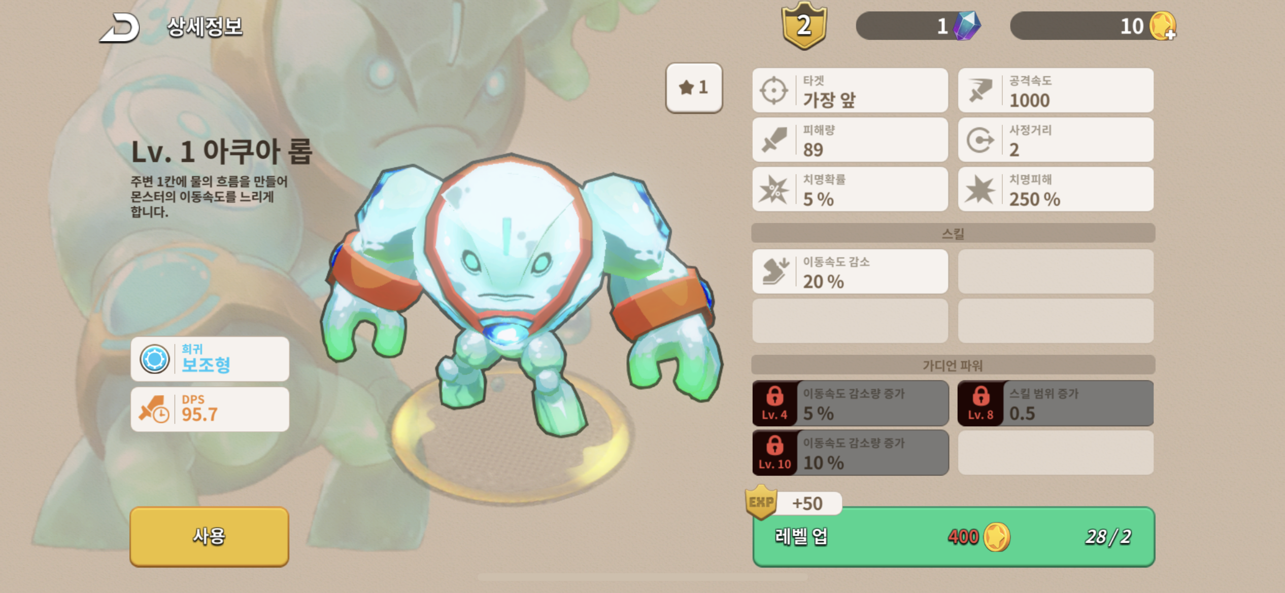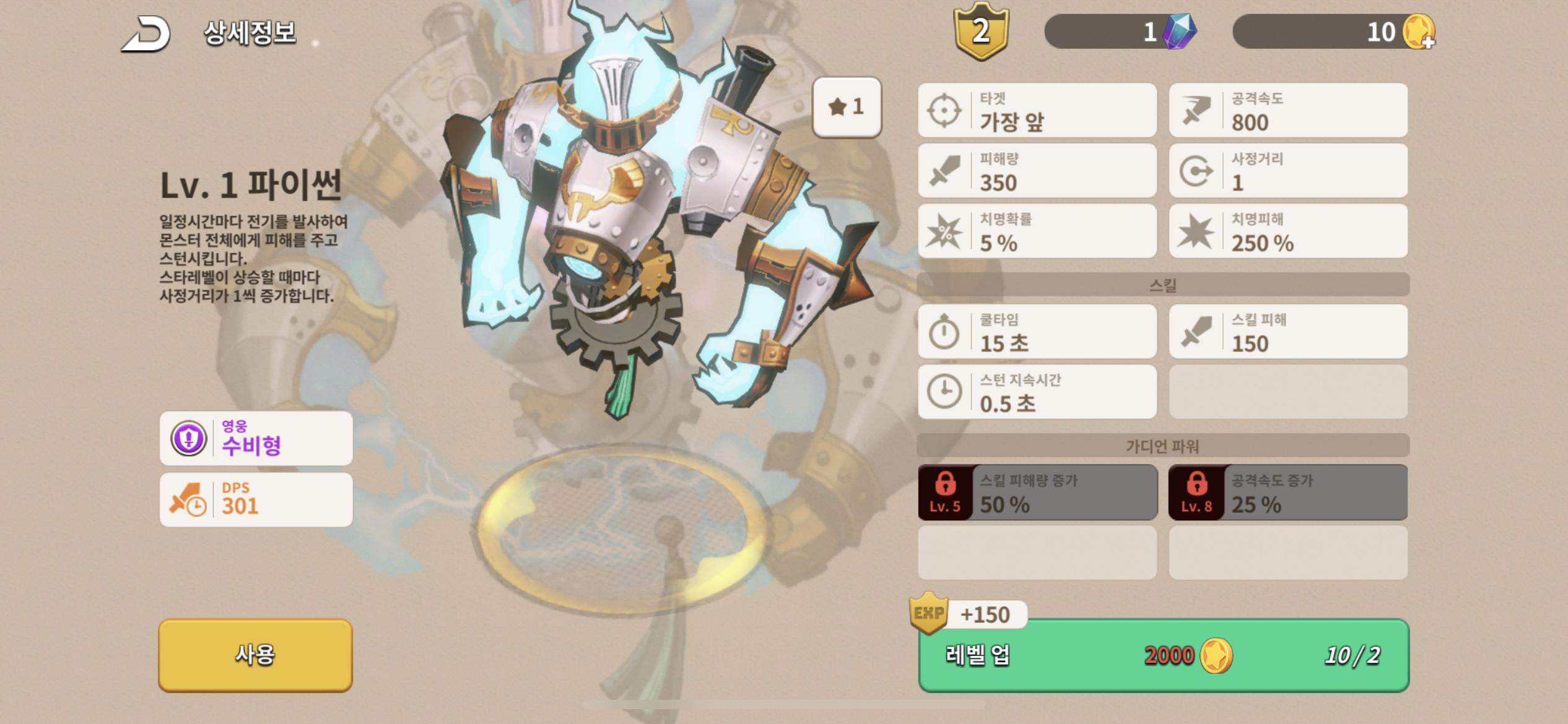 가디언 파워를 올려주면 피해량과 공격 속도, 사정거리가 증가하기 때문에 잘만 키워준다면 계륵 이상의 가치를 해낼 수 있습니다.