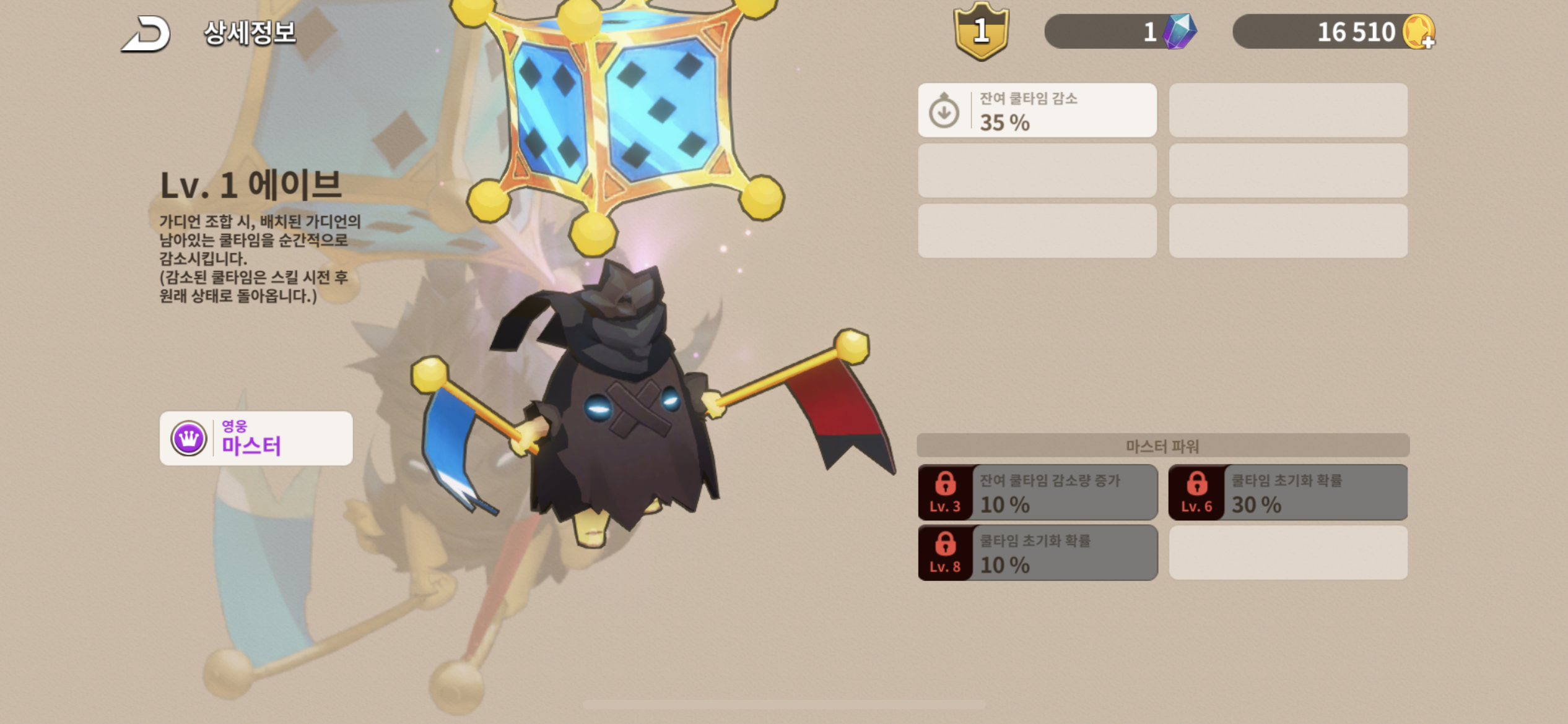 3. 에이브(영웅) : 배치한 가디언을 조합할 때, 배치된 가디언의 남은 쿨타임을 순간적으로 감소시켜줍니다.