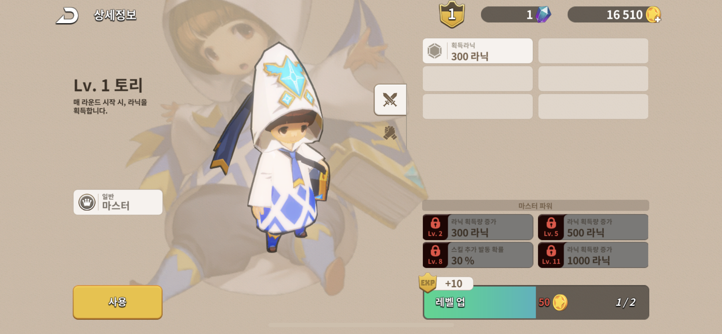 2. 토리(일반) : 매 라운드 시작마다 라닉을 획득하게 해줍니다. 마스터 파워를 올려줄수록 라닉 획득량과 스킬 추가 발동 확률이 늘어납니다.