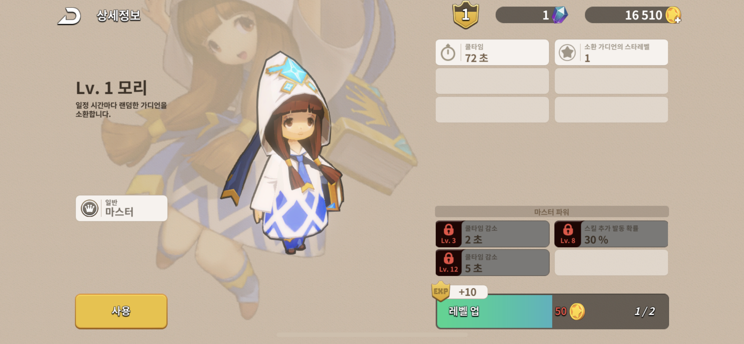 1. 모리(일반) : 일정 주기마다 가디언을 랜덤 하게 소환해줍니다. 마스터 레벨을 올릴수록 쿨타임과 스킬의 추가 발동 확률이 늘어납니다.