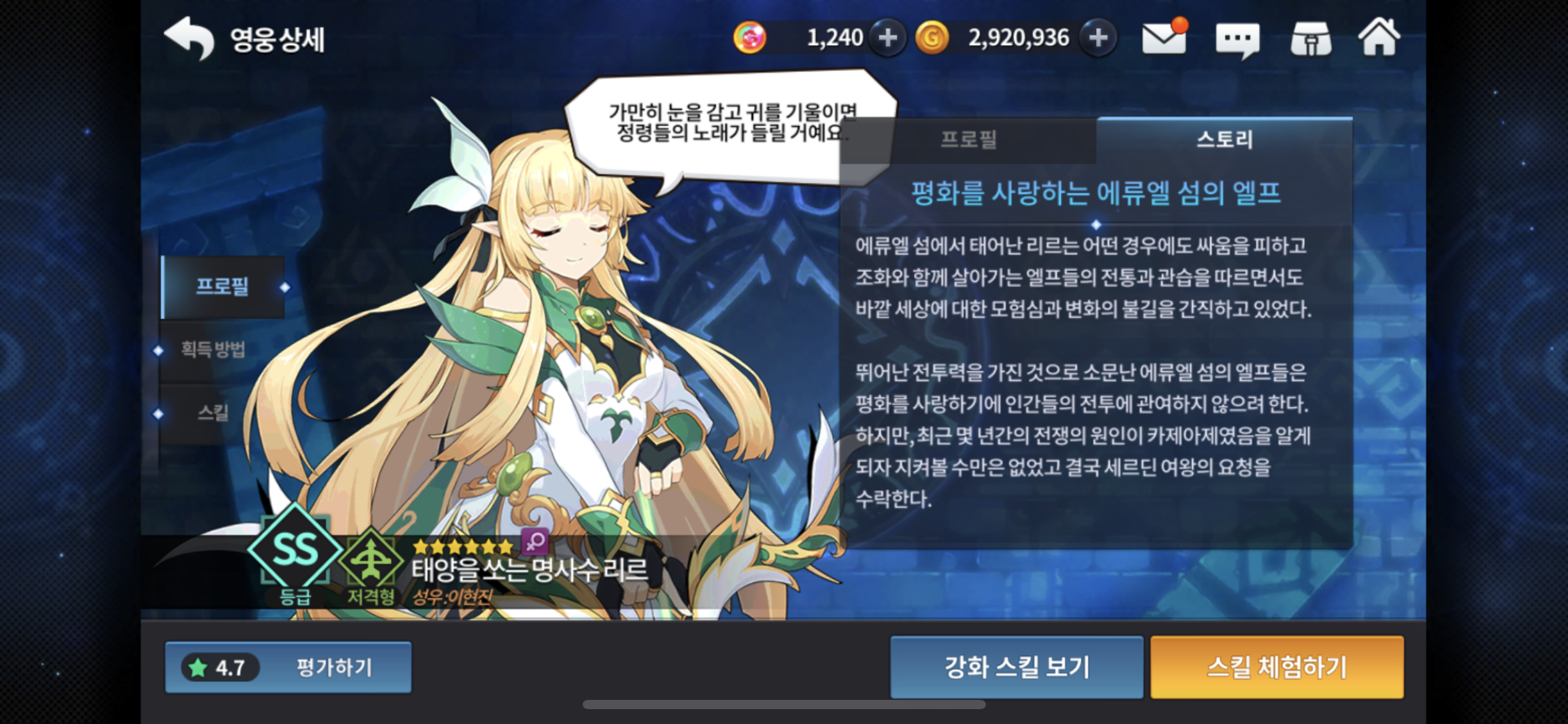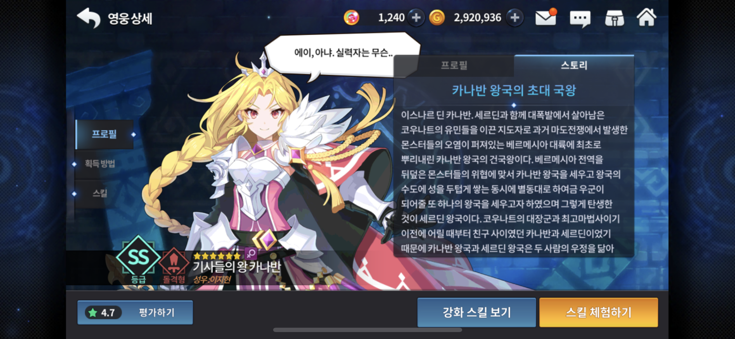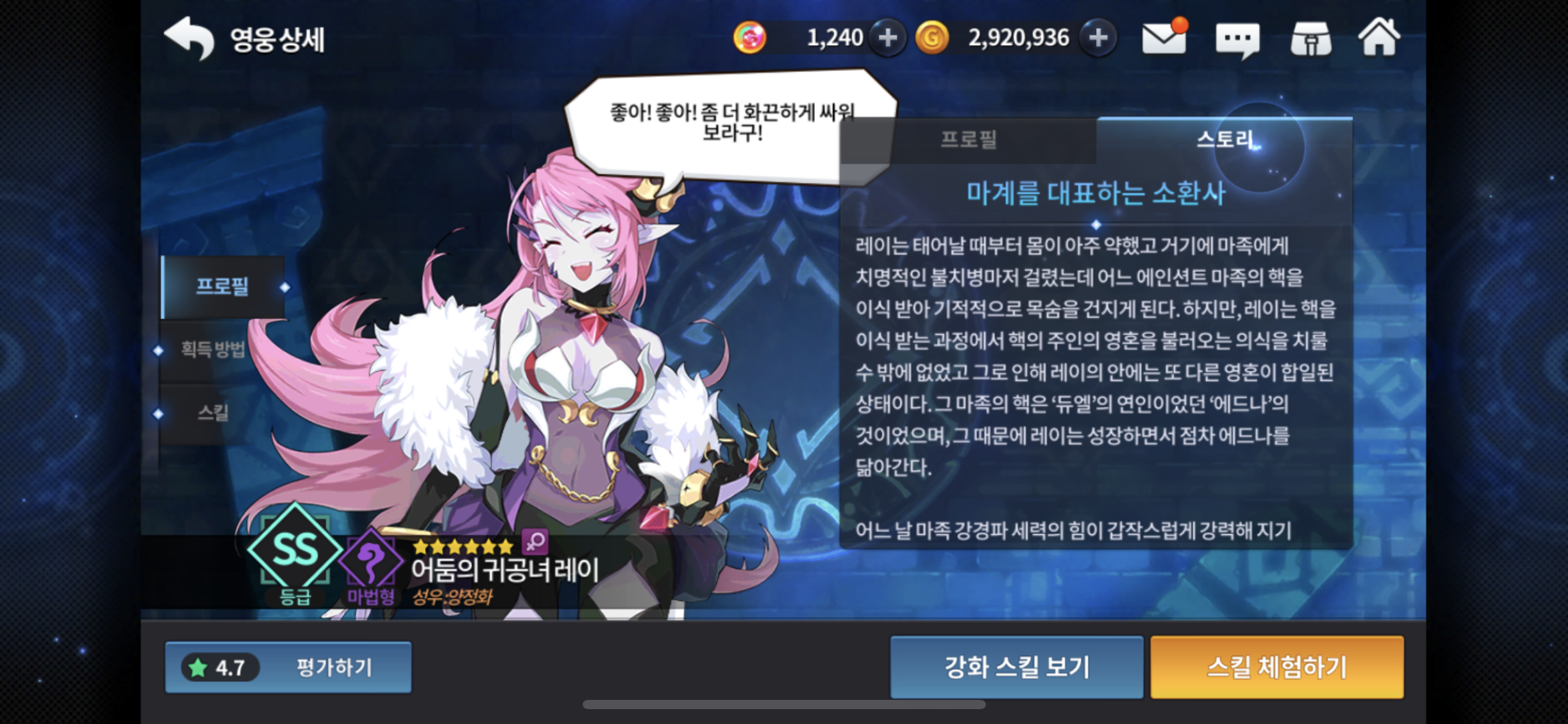 SS영웅 선택권에서 선택이 불가능하기에 뽑기로 뽑아야 하기는 하지만 꼭 있어야 하는 캐릭터입니다.