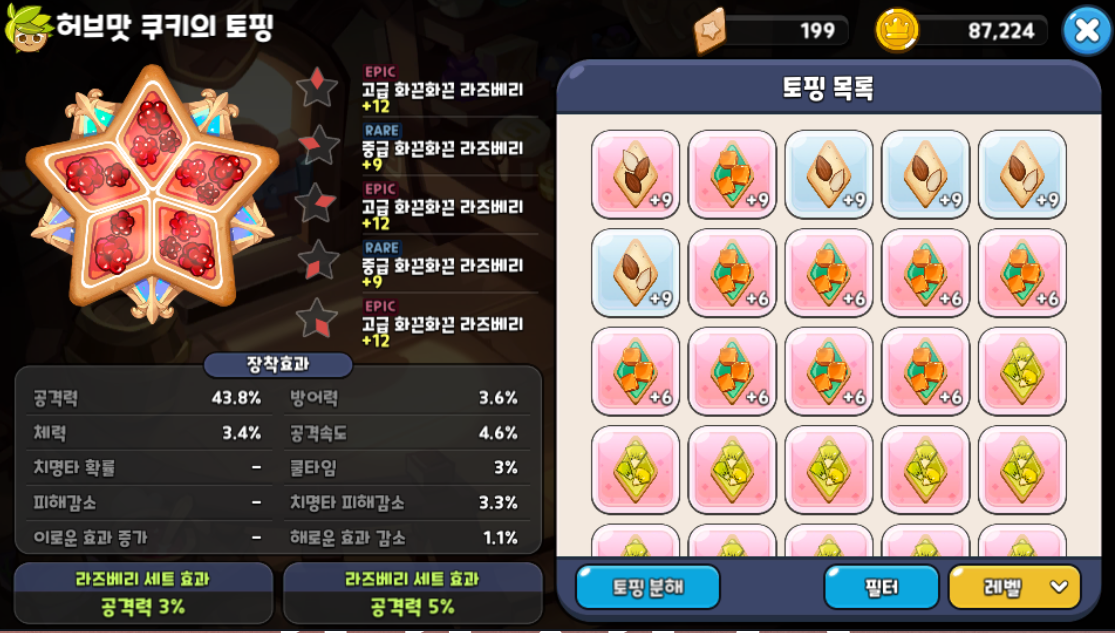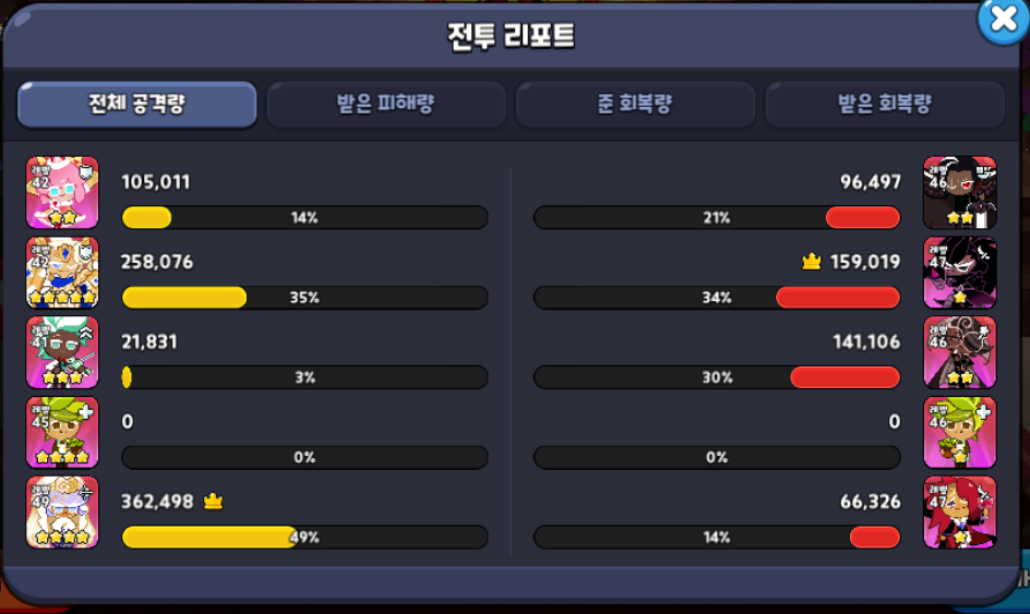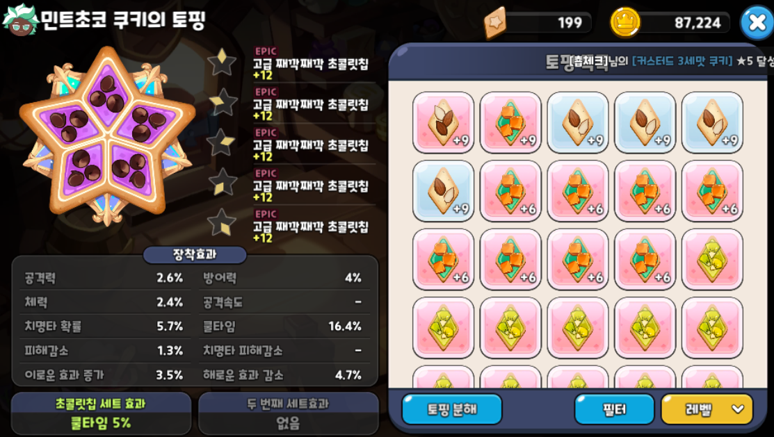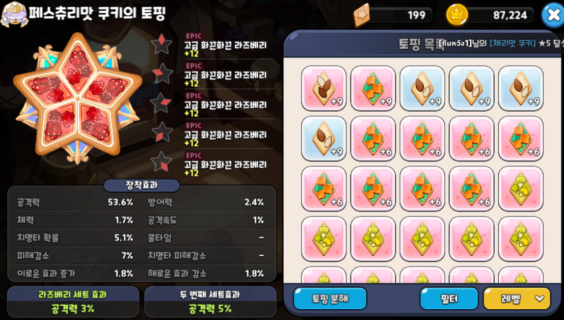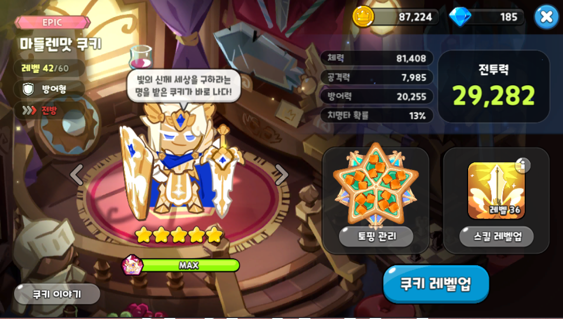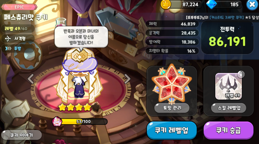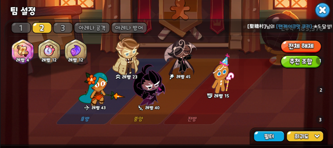 냉정하게 말해서 벨벳케이크맛 쿠키의 스펙이 5성 + 50~60 레벨이 아니라면 덱의 방향성이 너무 애매합니다.