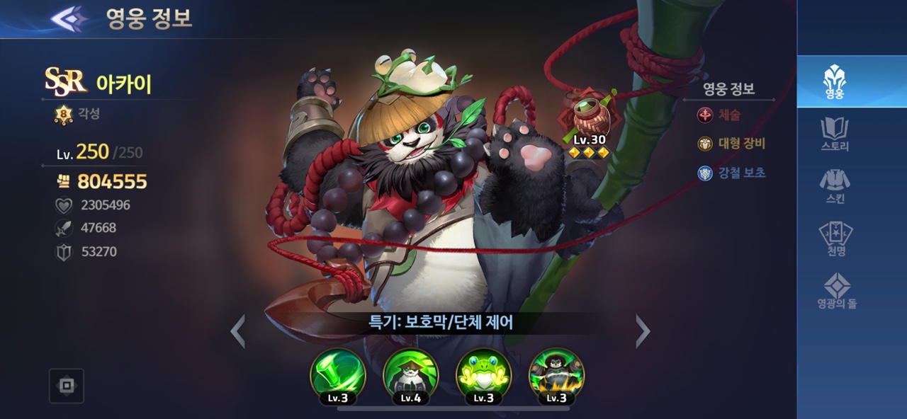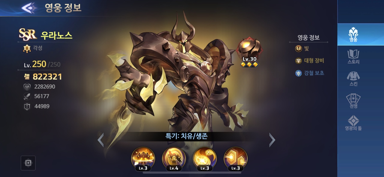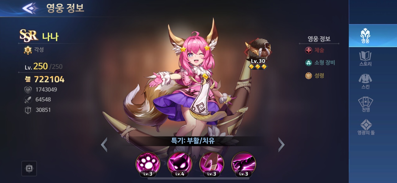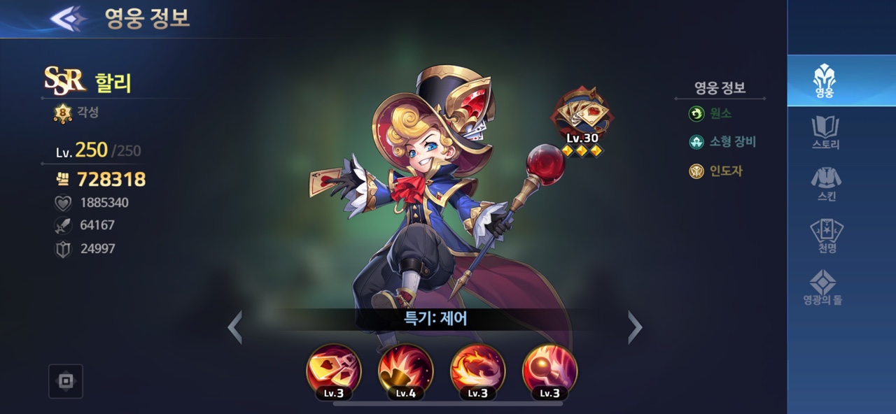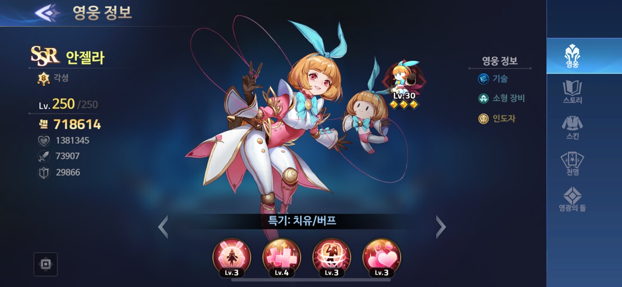 현재 많은 분야에서 원톱의 활용성을 보여주는 영웅이며, 레벨이 높아질수록 힐링 기와 부활기로 인한 스킬의 활용도가 매우 높아지기도 합니다.