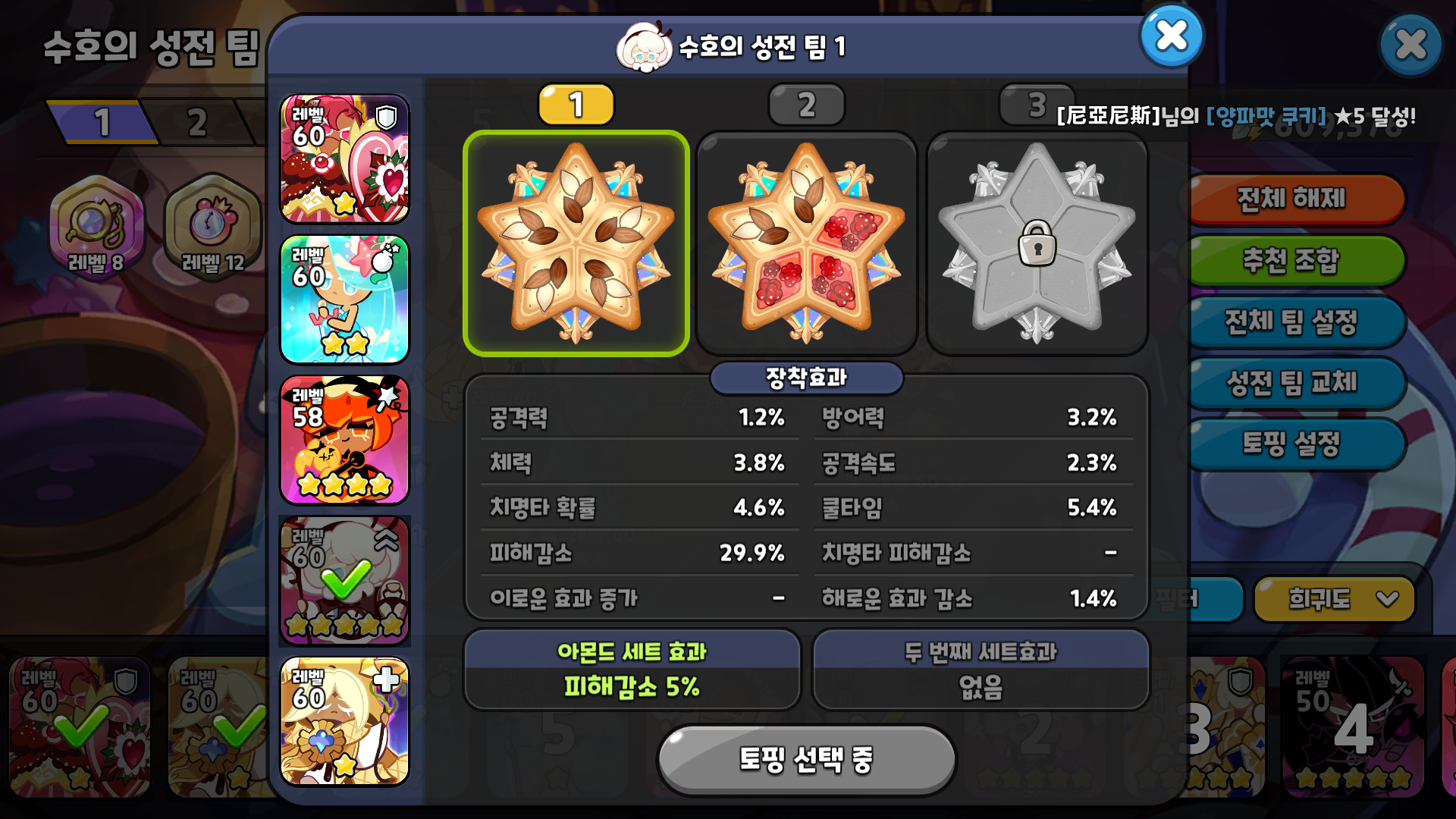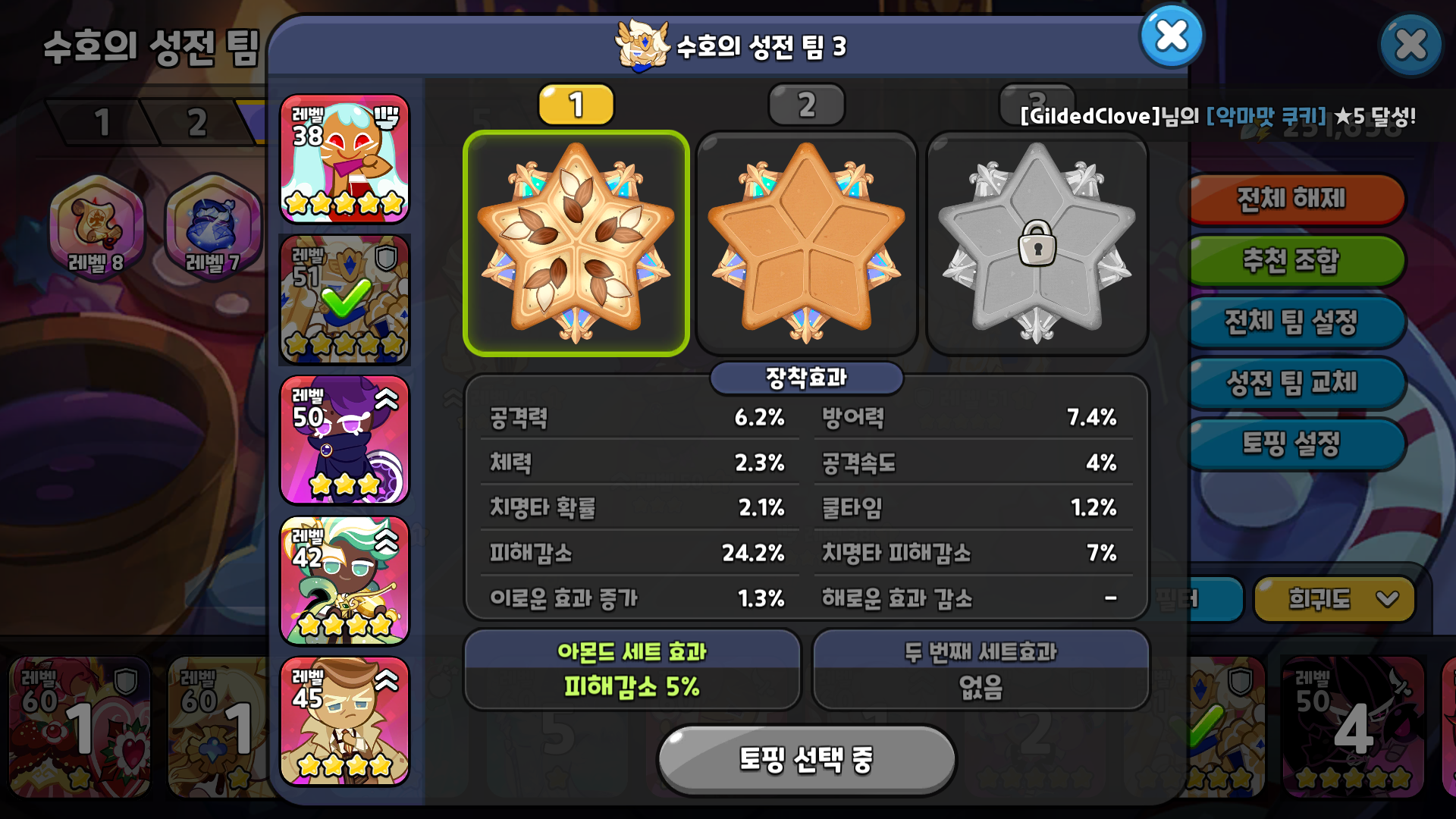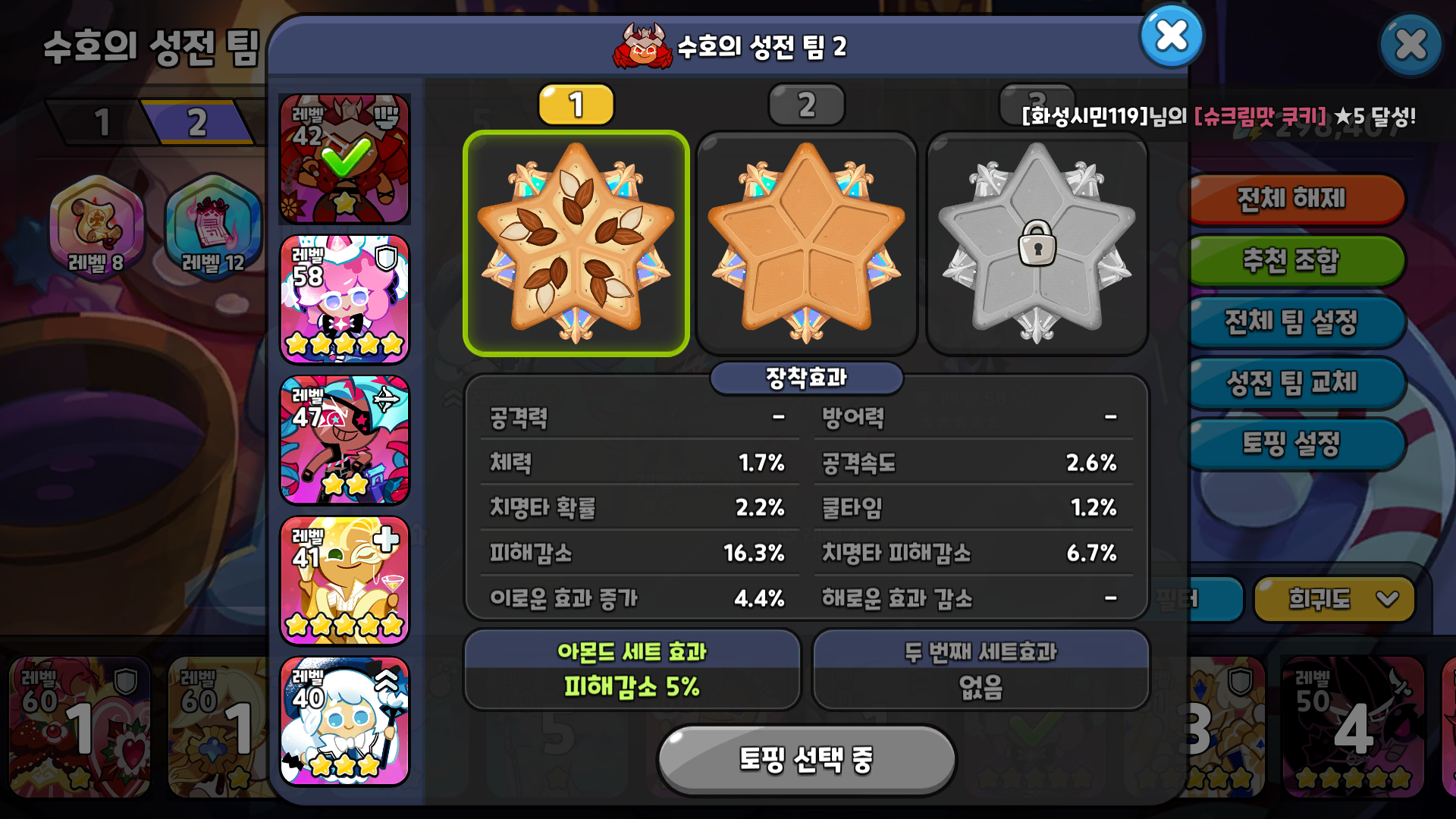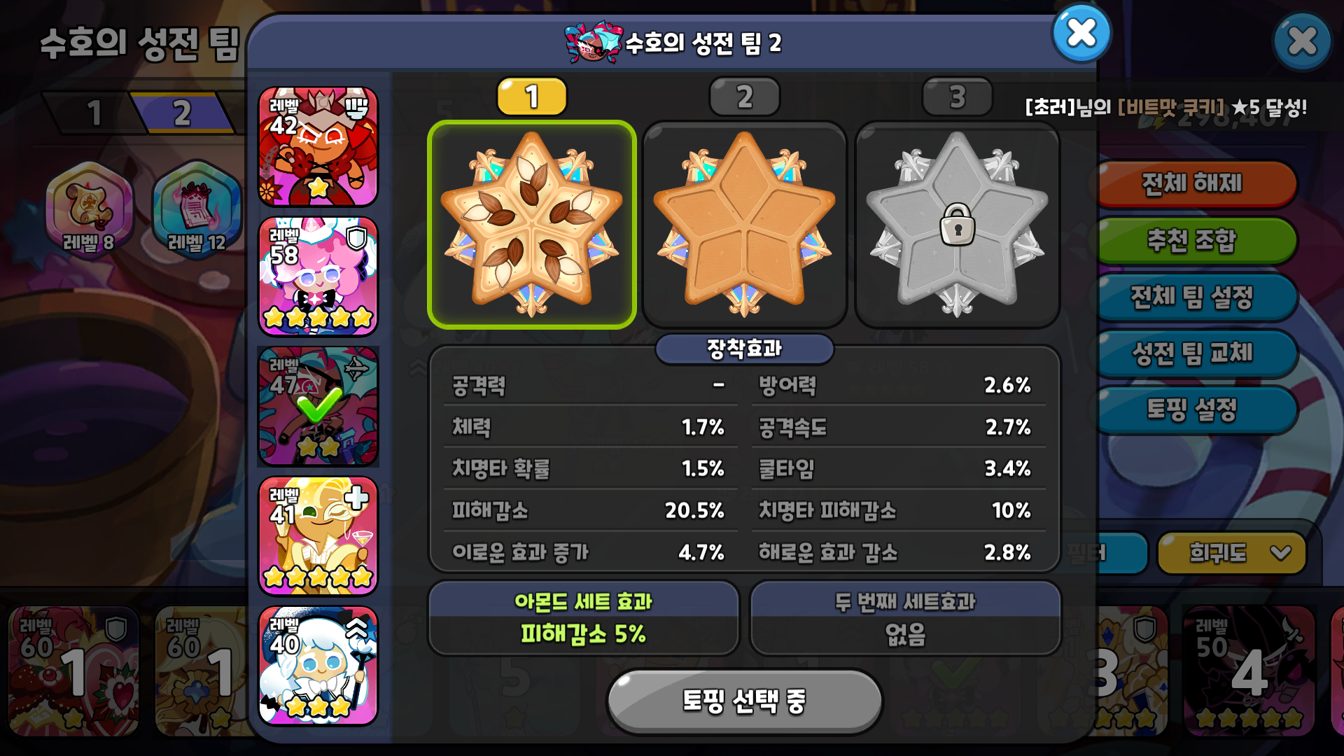 트위즐젤리 쿠키 : 아몬드 토핑 5개 / 부옵션 쿨타임감소 높을수록 좋음