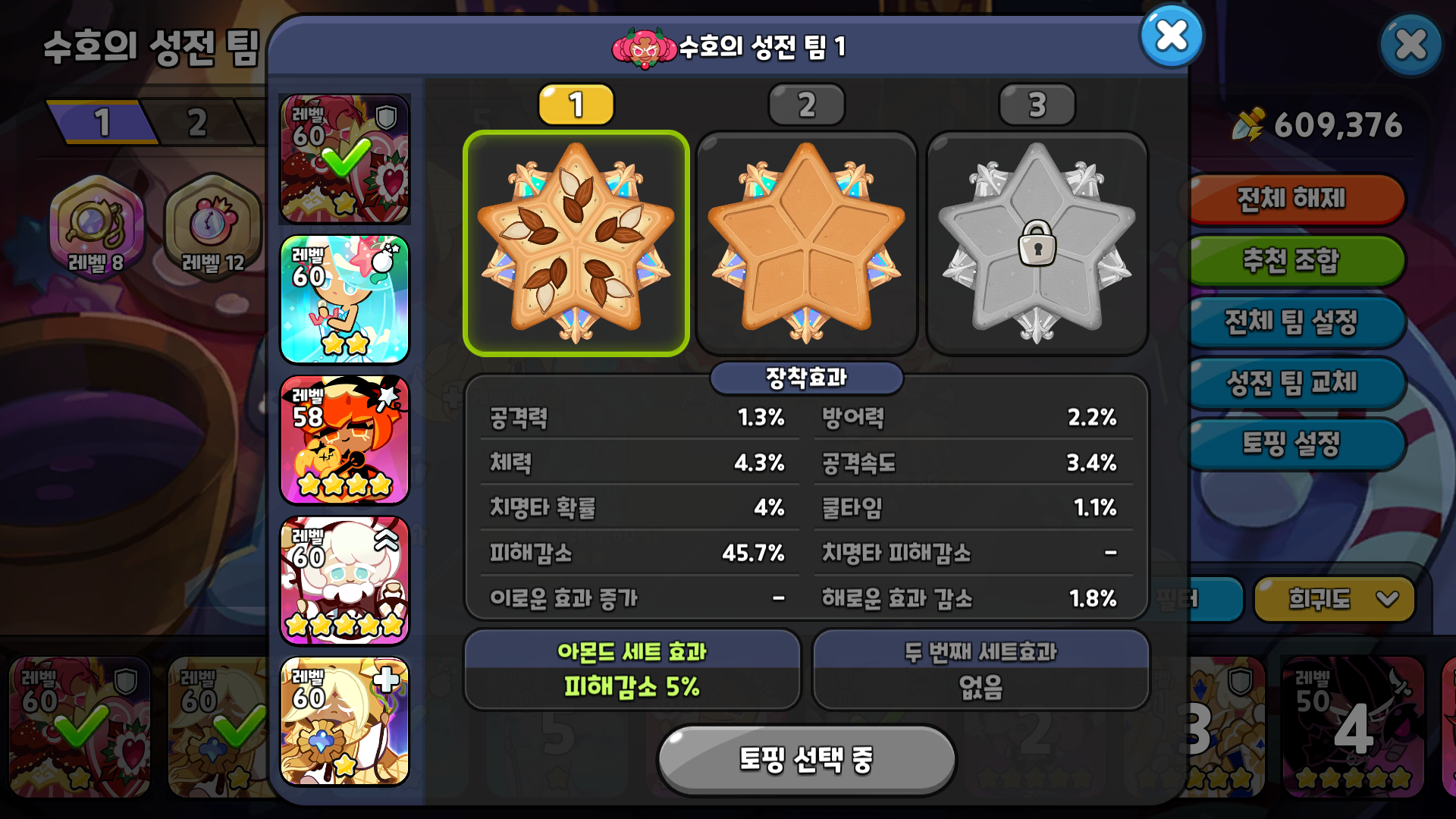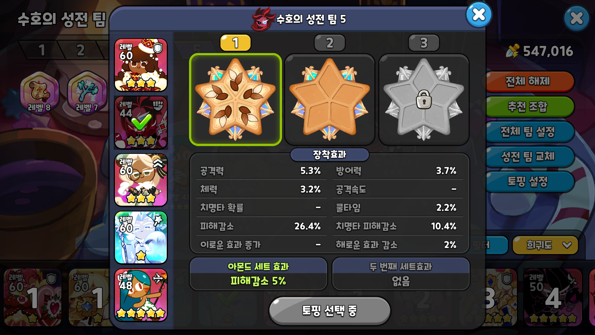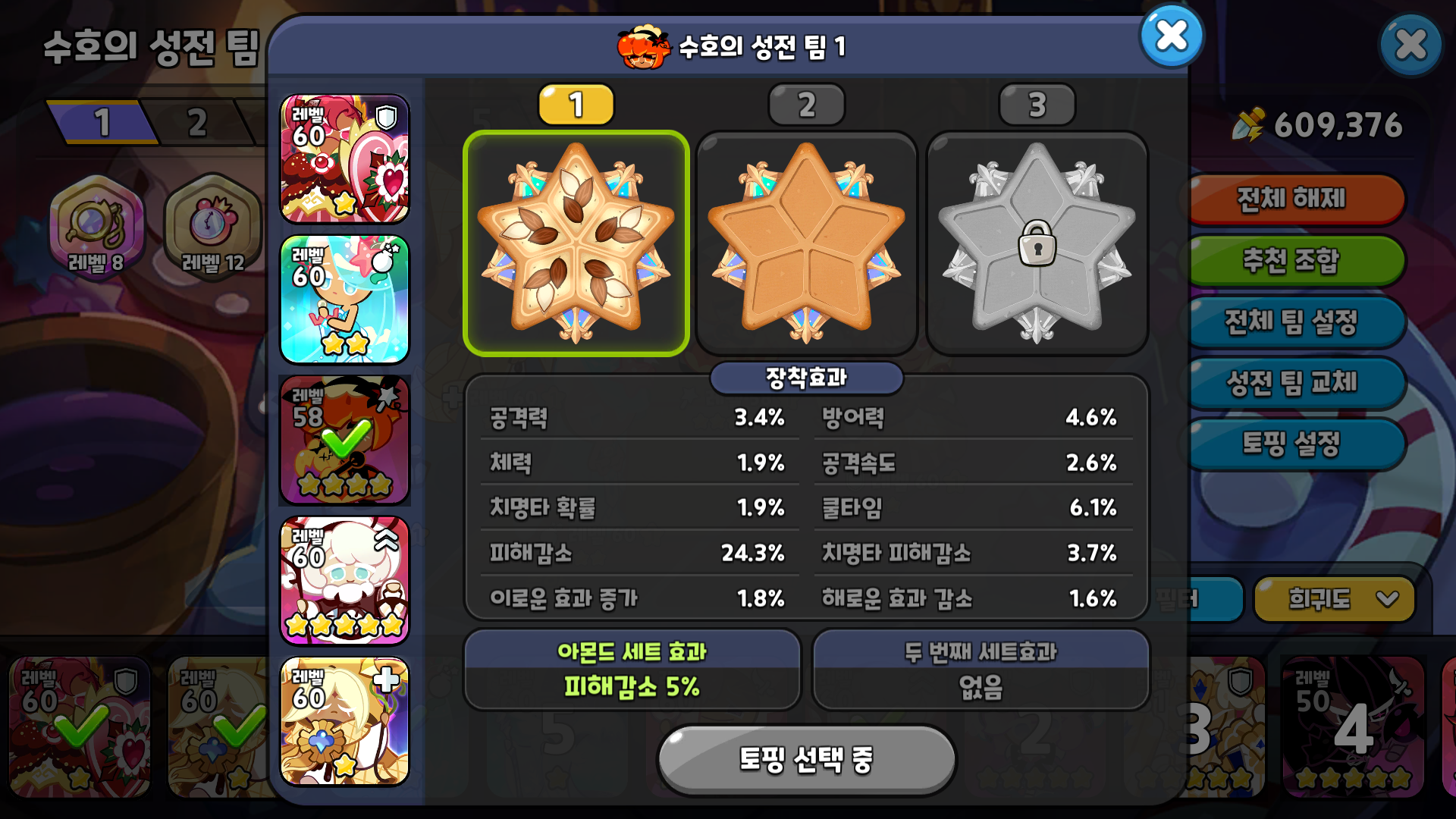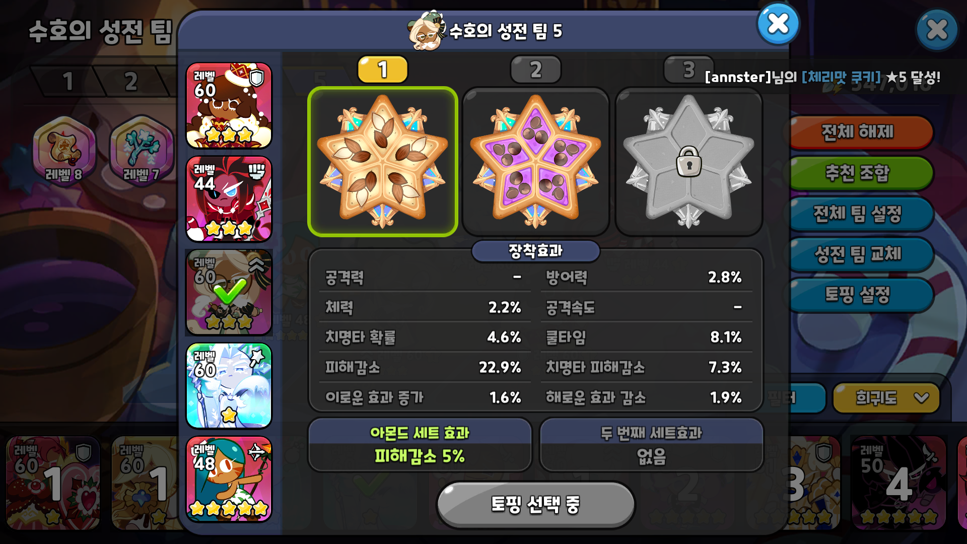 트위즐젤리 쿠키 : 아몬드 토핑 5개 / 부옵션 쿨타임감소 높을수록 좋음