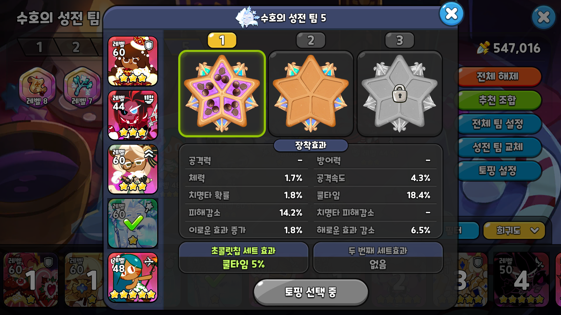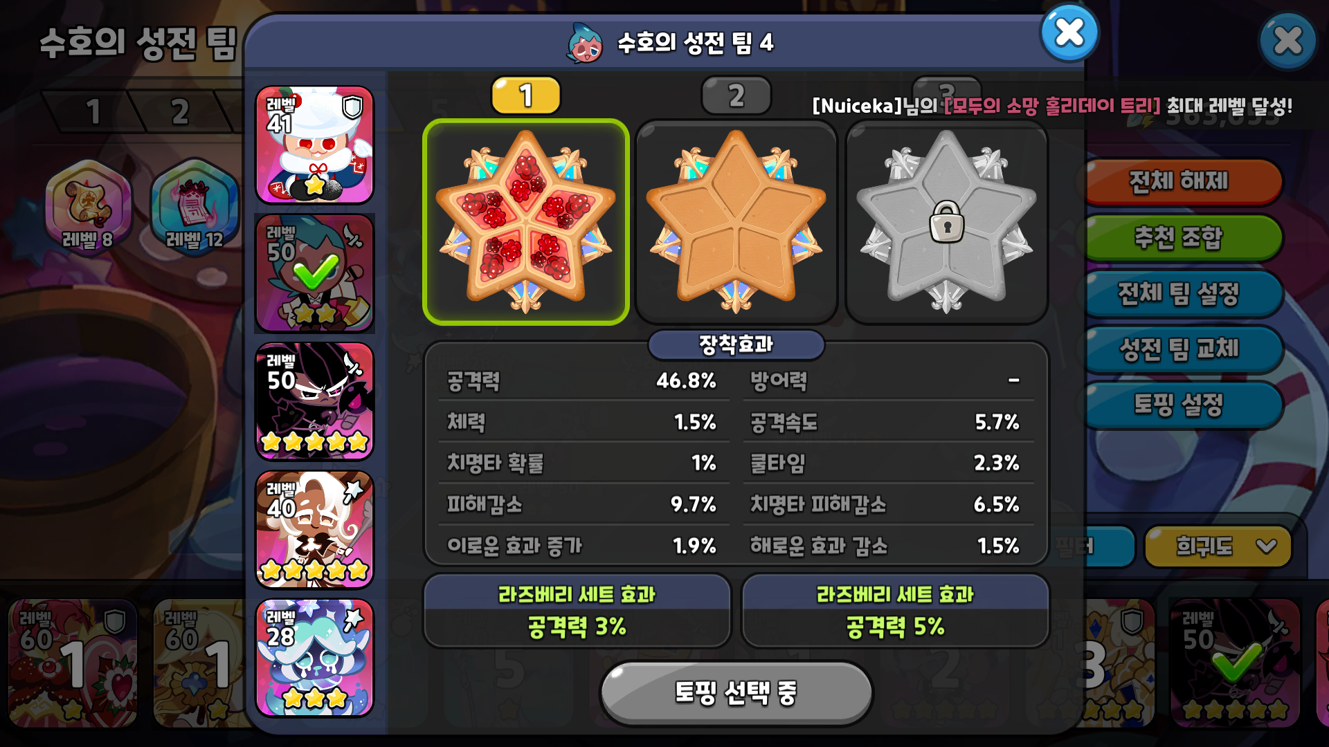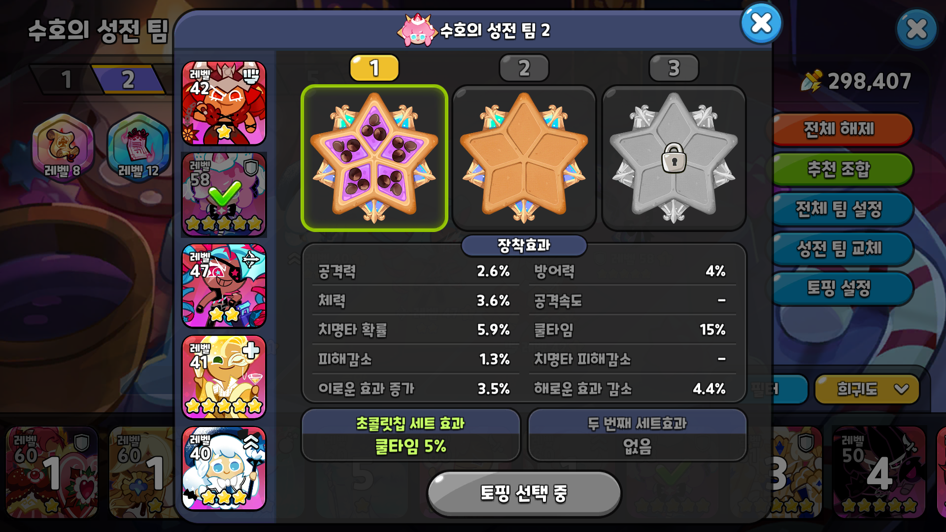 메인덱 쿠키들의 스킬을 한턴 쭉 돌려주신 뒤에 2번덱인 트위즐젤리덱으로 교체해주시면 됩니다,
