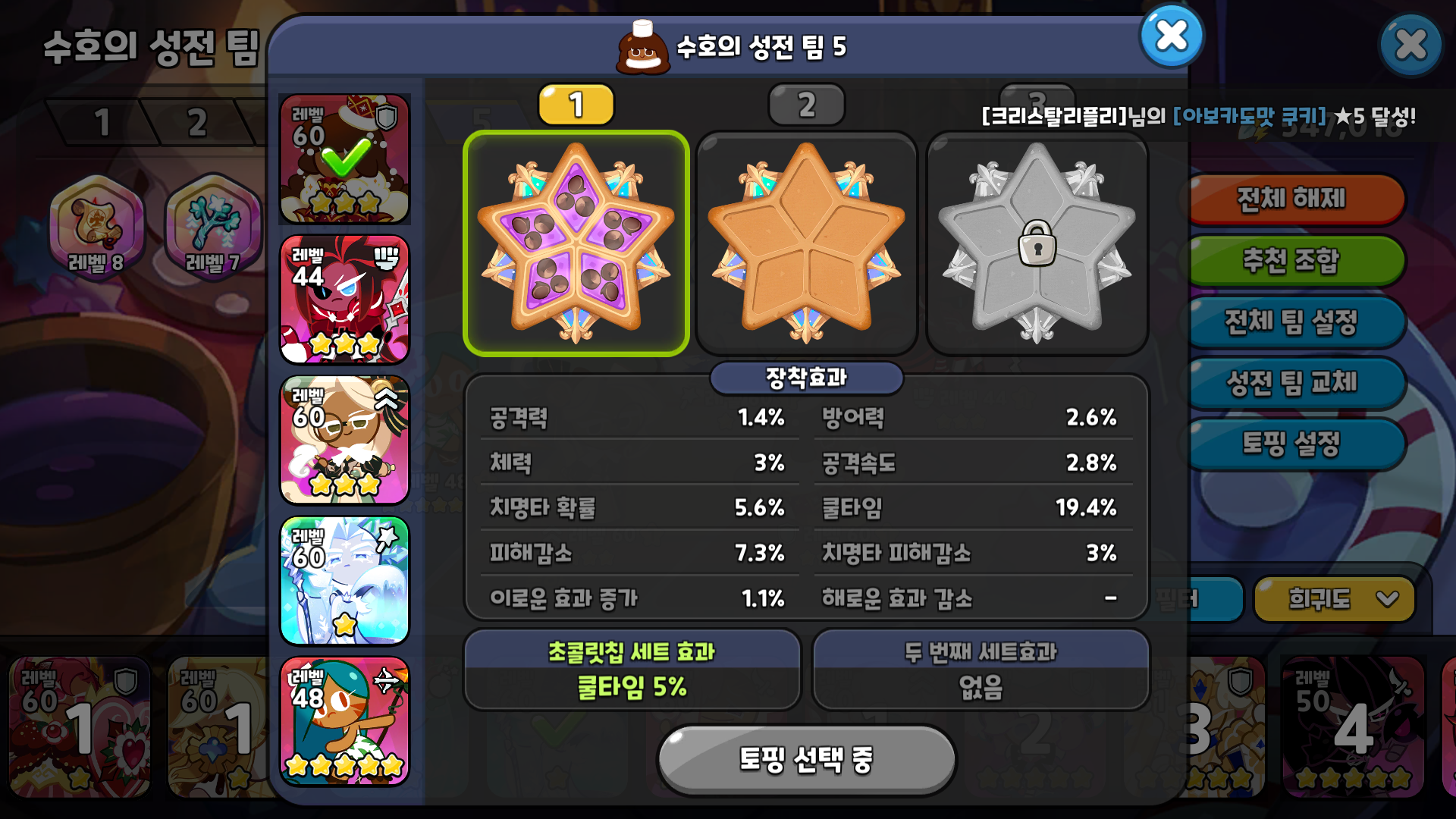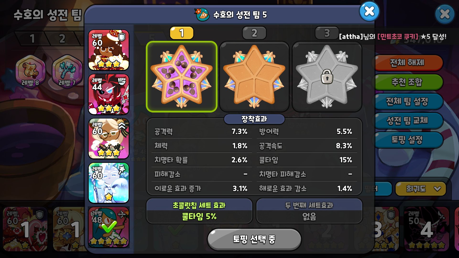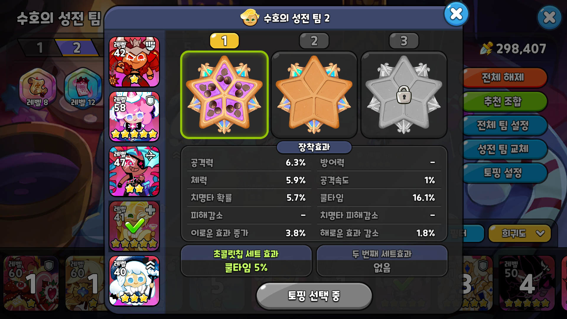 메인덱 쿠키들의 스킬을 한턴 쭉 돌려주신 뒤에 2번덱인 트위즐젤리덱으로 교체해주시면 됩니다,